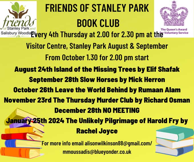 The Friends of Stanley Park hold their book club meeting on the 4th Thursday of each month. The next meeting is on Thursday 27th October 2022 at 2.30pm in the Stanley Park Visitor Centre next to the cafe. New members welcome.